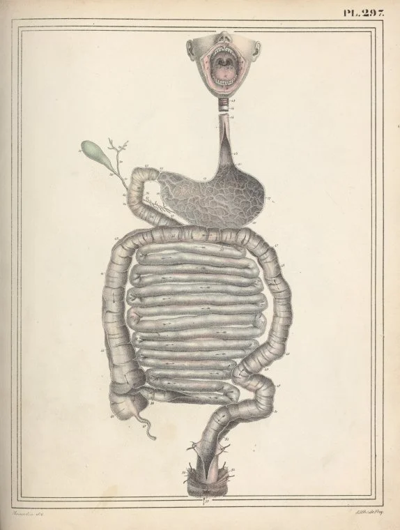 Parece una obra de arte, pero incidental, lo que la hace todavía más admirable y cautivadora. Es una de las 300 láminas de un atlas de anatomía de mediados del siglo XIX, realizado por el cirujano francés Jules Cloquet. En la Lámina 297, Cloquet dividió el tracto digestivo en 53 secciones, desde los labios hasta el ano, un viaje de aproximadamente dos o tres días a través de canales, tubos, piscinas de productos químicos y cámaras porosas finamente diseñadas por la evolución, todas cosas sobre las cuales probablemente sepamos menos de lo que sabemos sobre las lunas de Júpiter. La cuestión es que a través de la ilustración de Cloquet seguimos la trayectoria de lo masticado (conocido como bolo) a medida que se abre paso hacia el estómago, se convierte en una densa papilla lechosa, que cae hacia el duodeno y desde allí hacia el íleon, el ciego, el colon y el recto, mientras al mismo tiempo podríamos haber estado pensando en cuánto nos queda en el banco o en cómo parecer más guapo y respetable. Para nosotros los profanos, quizá la lección de la imagen de Cloquet vaya sobre la humildad. Ninguna solemnidad del ser humano se mantiene intacta tras echarle un vistazo a nuestro tracto digestivo. Nuestra boca, el instrumento a través del cual articulamos nuestras ideas y a través del cual comunicamos nuestros sentimientos más tiernos, está inevitablemente conectada a una red invisible de tubos malolientes e intrincados. Como enfatizó en el siglo XVI Michel de Montaigne: «Los reyes y los filósofos cagan, y también las damas». Por lo que no deberíamos castigarnos tan duramente por nuestras fallas en materia de inteligencia, de dignidad, de seriedad. Ya es un milagro que logremos tener pensamientos coherentes, que logremos tener de vez en cuando momentos de gracia, dada la química pestilente que reside en nuestro interior. Cuando nos castigamos por no ser lo suficientemente buenos en algo deberíamos recordar lo improbable que es el ensamble de tubos y esfínteres que, a fin de cuentas, somos. «En el trono más alto del mundo, seguimos sentados sobre el culo», añade Montaigne. Y con la ayuda de Cloquet podemos ponernos a reflexionar un rato sobre lo que eso podría significar.
